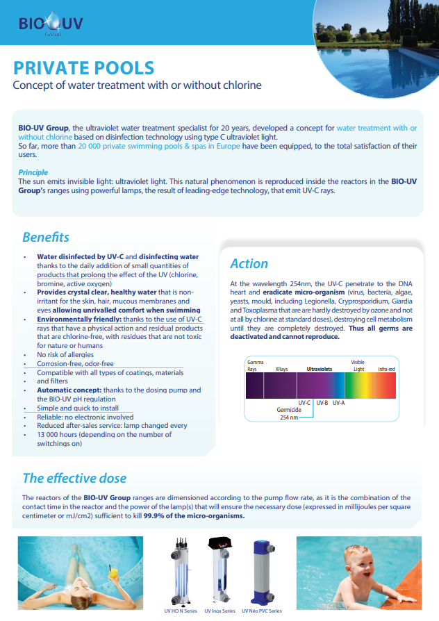 - Water disinfected by UV-C and disinfecting water thanks to the daily addition of small quantities of products that prolong the effect of the UV (chlorine, bromine, active oxygen)