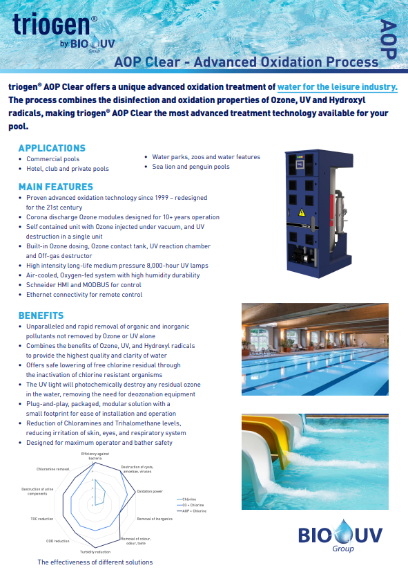 triogen® AOP Clear offers a unique advanced oxidation treatment of water for the leisure industry. The process combines the disinfection and oxidation properties of Ozone, UV and Hydroxyl radicals, making triogen® AOP Clear the most advanced treatment technology available for your pool.